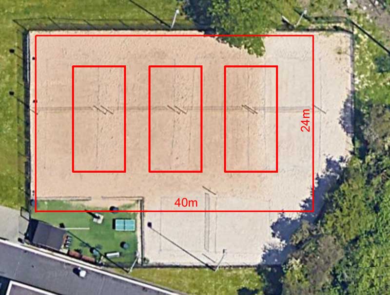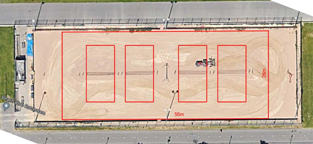 NesseBeach heeft 6 beachvelden en de afmetingen van het terrein zijn ongeveer 80m x 28m. Effectief is de beschikbare ruimte 74m x 26m. Hier is een blaashal met 4 beachvelden mogelijk, rekening houdend met 5m rondom de velden.