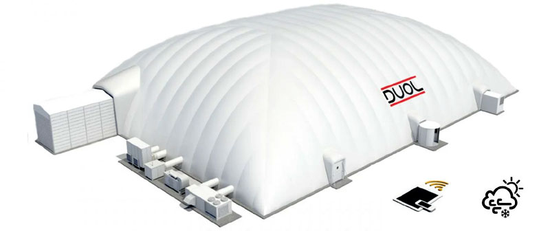 Een blaashal kan je niet zomaar op zand neerzetten, helaas. Rondom de velden dient er een brede en gladde betonnen rand te zijn, van zeker 1 meter breed, waar de blaashal op komt te staan. Dan krult de flap van de binnenwand naar binnen en de flap van de buitenwand naar buiten, zo dat er geen lucht ontsnapt via de onderkant.