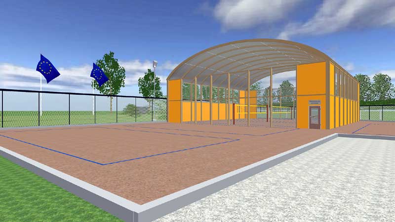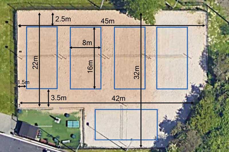 In de zomer zijn er dan 5 velden beschikbaar, waarvan 3 volledig open. Er zijn 2 velden overkapt, maar half open. Het zou er zo uit kunnen zien als op de schets.